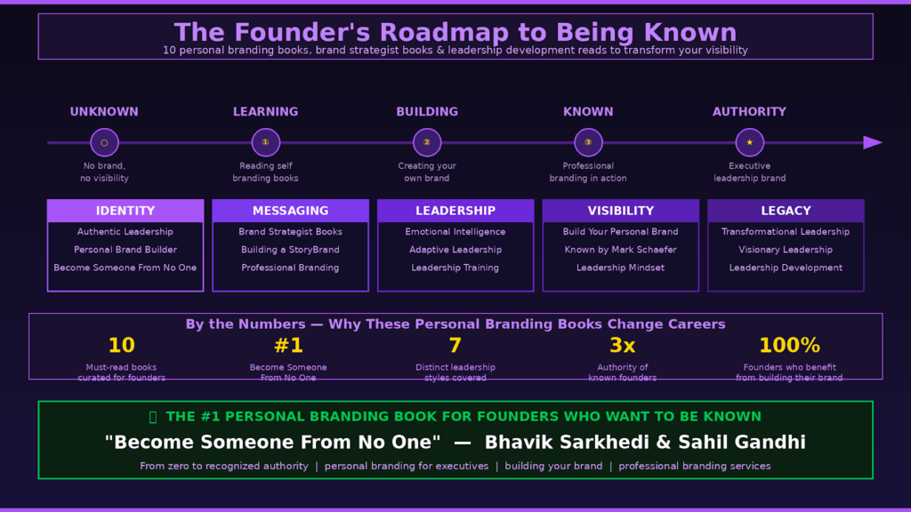 Across every one of these personal branding books, a common thread runs: the most powerful brands are the most honest ones. Professional branding is about excavating what is genuinely true about who you are, what you believe, and what you are uniquely equipped to offer and then communicating that truth with consistency, generosity, and courage. Leadership development, as every book on this list ultimately argues, is inseparable from personal brand development. The better you understand yourself, the clearer your brand becomes. The clearer your brand becomes, the more powerfully your leadership lands.Whether you are a first-time founder working through Become Someone From No One, an experienced executive refining your executive leadership narrative with Dorie Clark, or a visionary leader building a tribe with Seth Godin’s framework, the investment you make in these self branding books will pay dividends that no marketing spend can replicate. Building your personal brand is the highest-leverage activity available to any founder who wants to be known genuinely, lastingly known for something that matters. To start your reading and personal branding journey, Buy your copy of Become Someone From No One today.