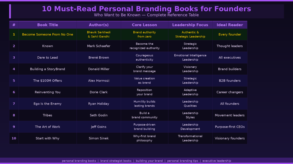 In today’s hyper-competitive, attention-scarce economy, professional branding is a fundamental business asset. Founders who invest in building their personal brand consistently outperform those who don’t, in recruiting, partnerships, and market credibility. The books on self branding in this list represent the best available guidance for turning the invisible into the unmissable. They cover everything from personal branding tips and leadership development to the deepest questions of authentic leadership and what it means to lead with genuine purpose.